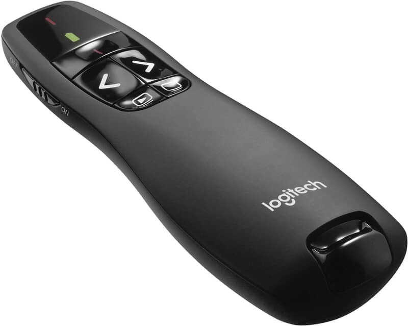 Presentador logitech R400, incluye cargador, adaptador USB y manual de usuario